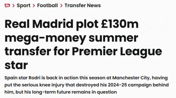 据英媒小报《每日星报》报道,皇马正计划对曼城发动转会“突袭”,可能以1.3亿镑的价格收购罗德里。